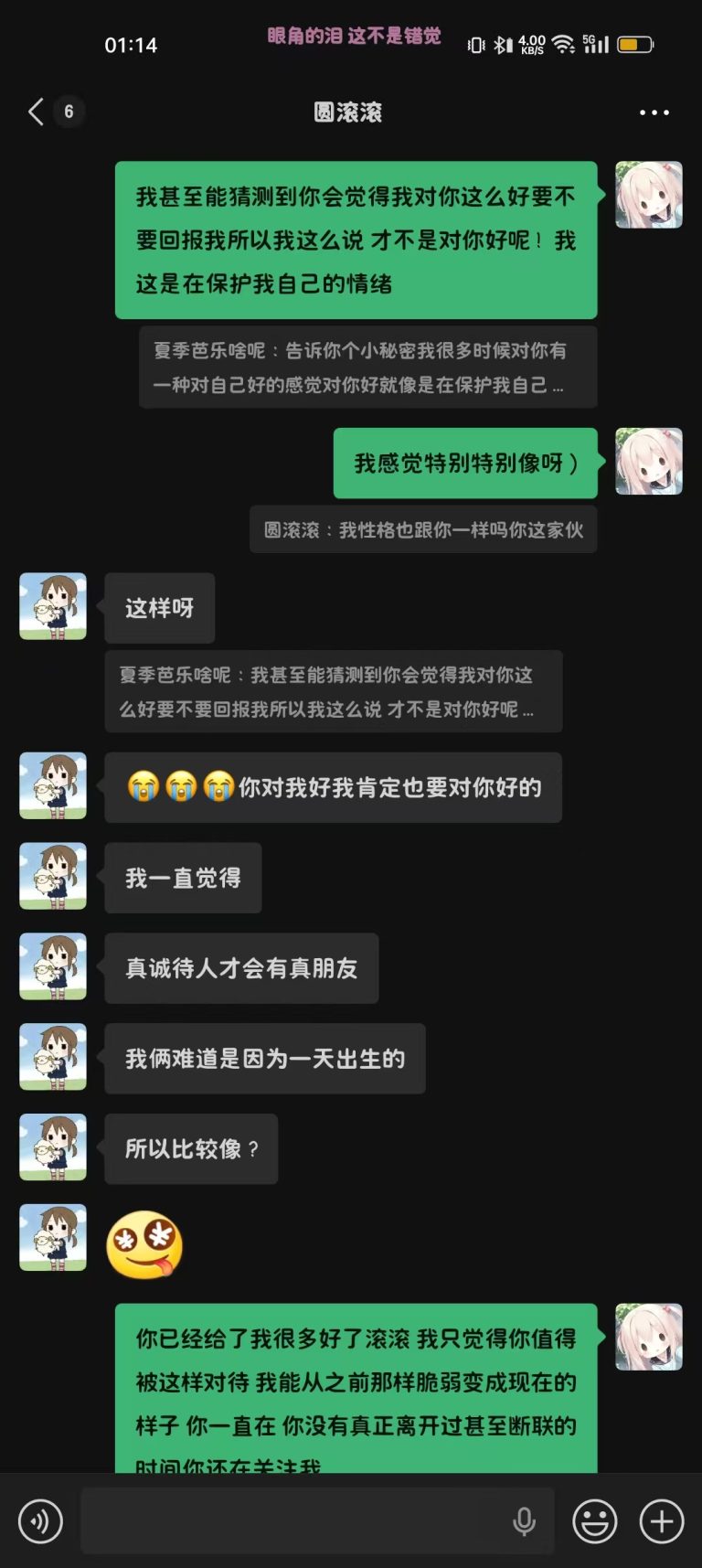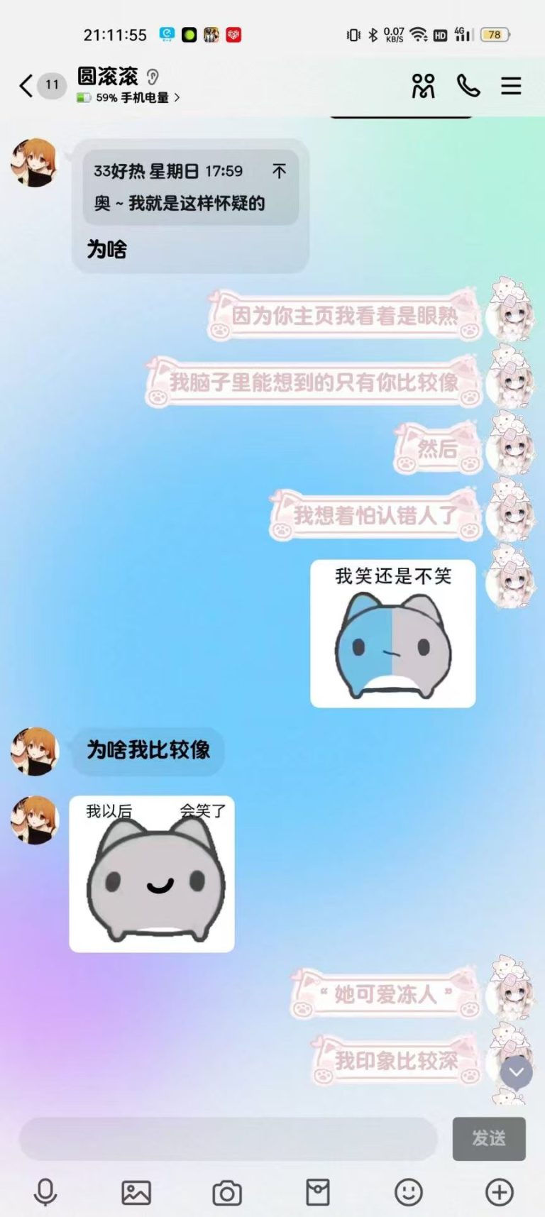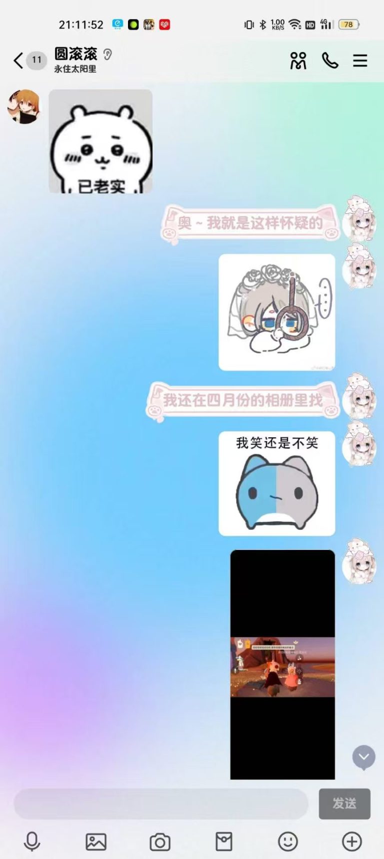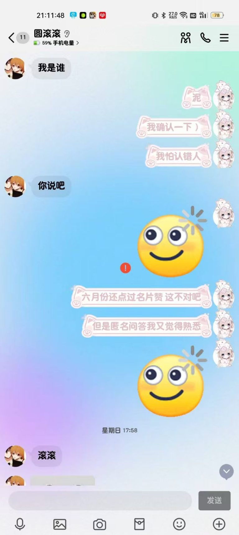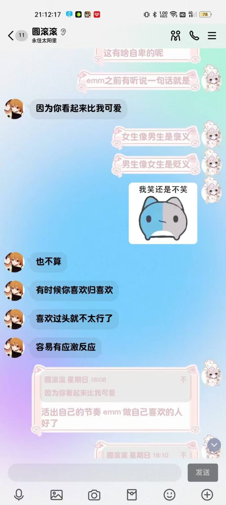 2024年12月1日21:34我们加回了微信好友,只是这会的滚滚跟第二人格一样发一些十八×的表情包所以自此以后她的微信备注就是“圆滚滚之第二人格”