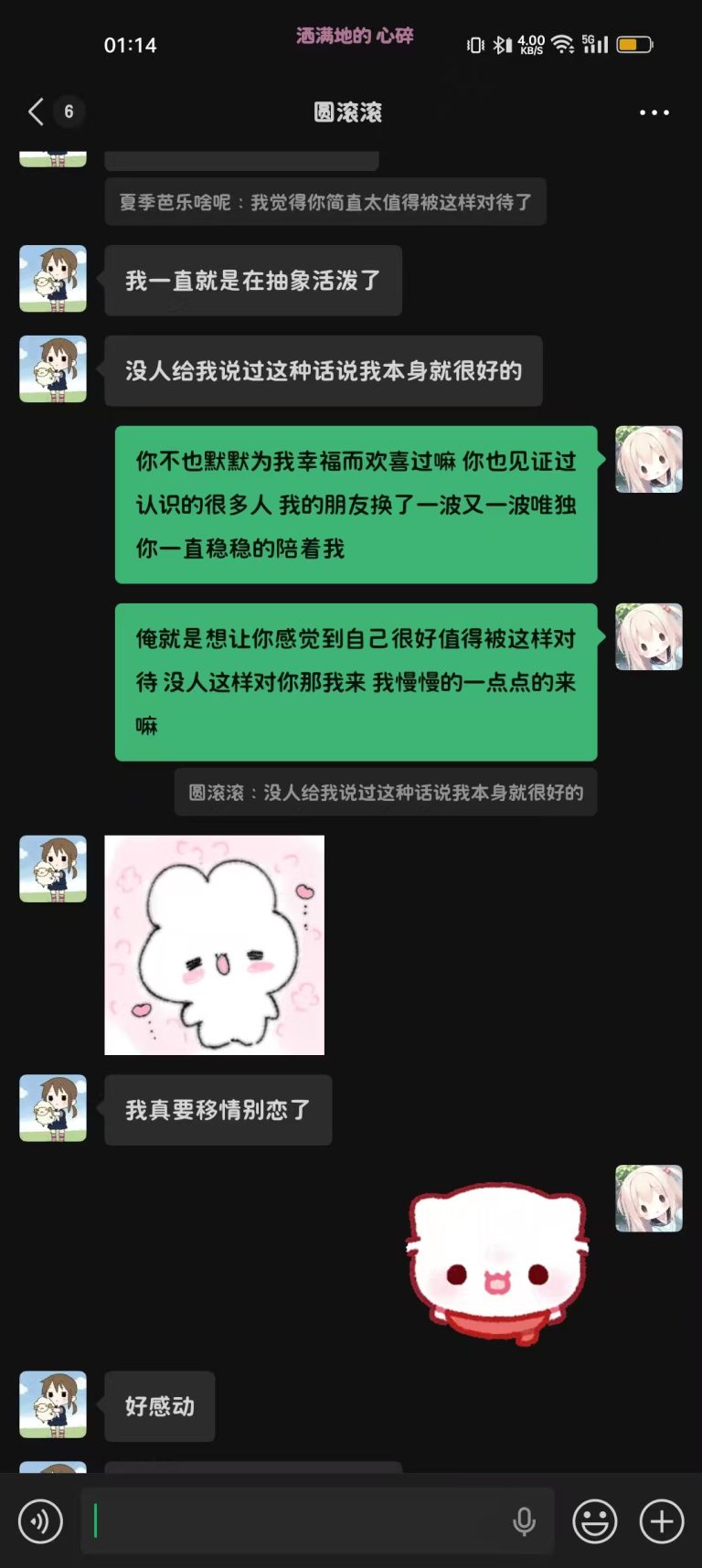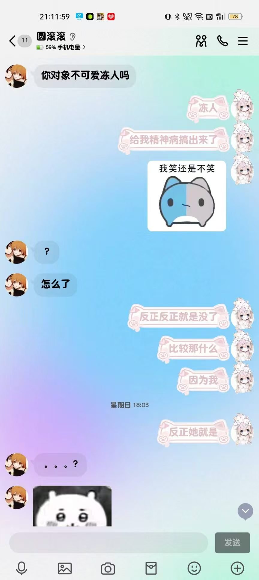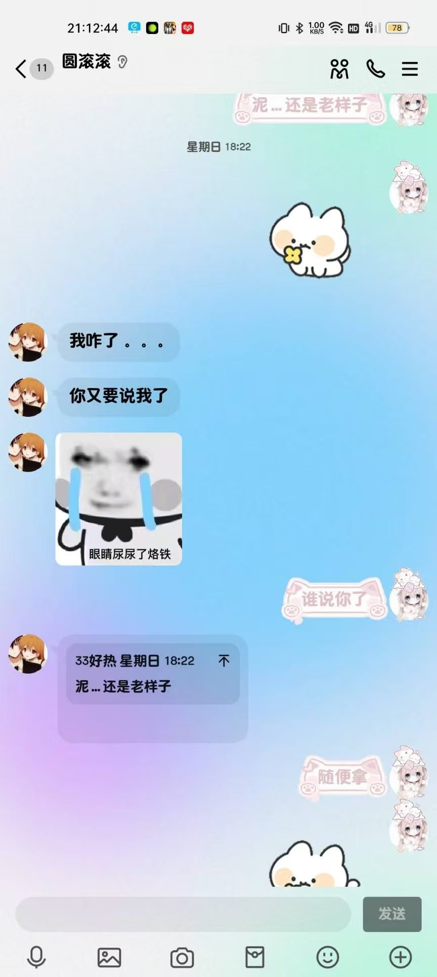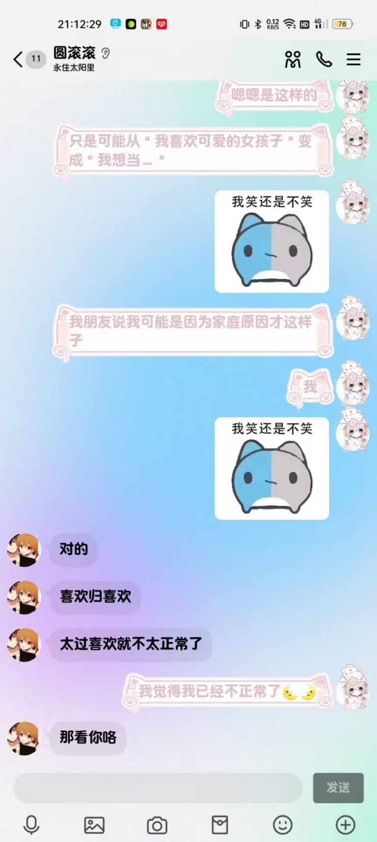 2024年12月1日21:34我们加回了微信好友,只是这会的滚滚跟第二人格一样发一些十八×的表情包所以自此以后她的微信备注就是“圆滚滚之第二人格”