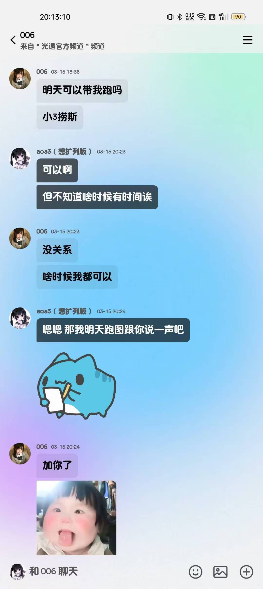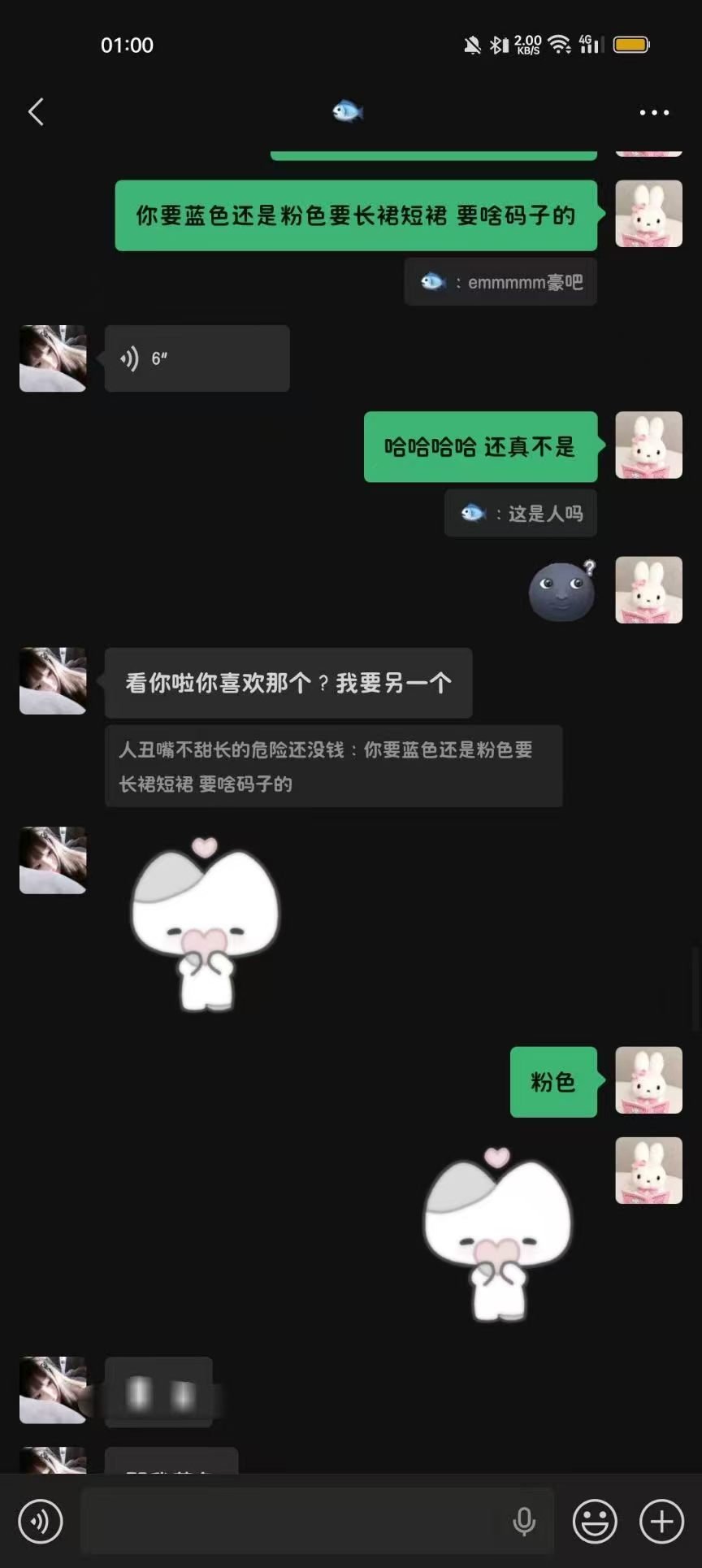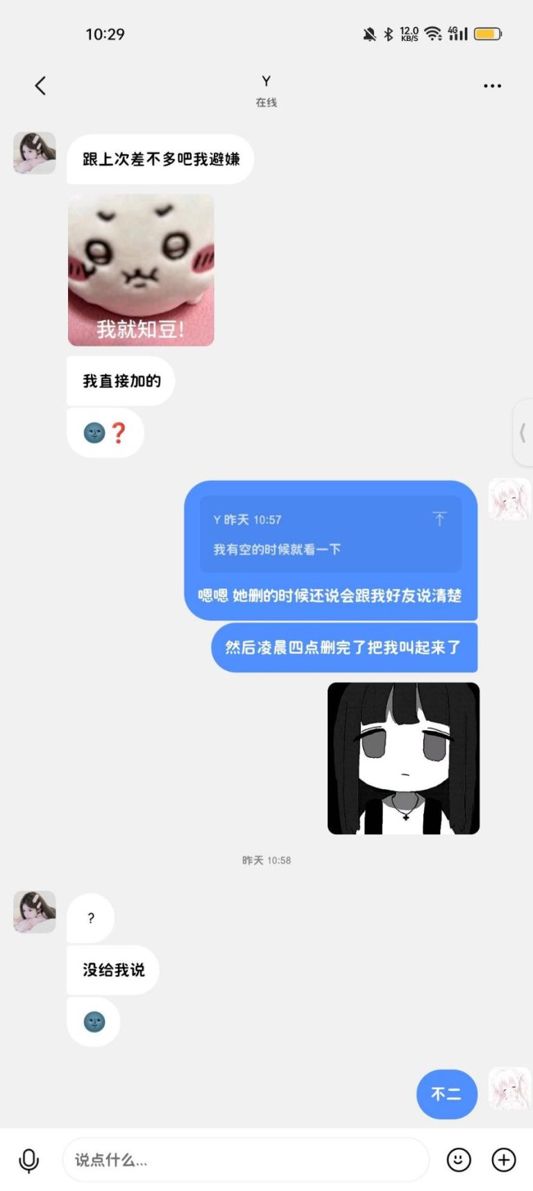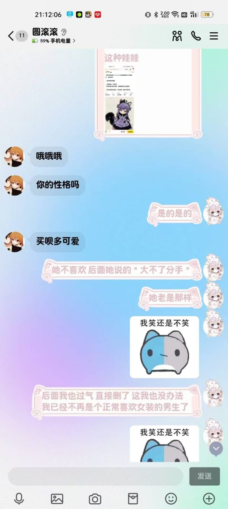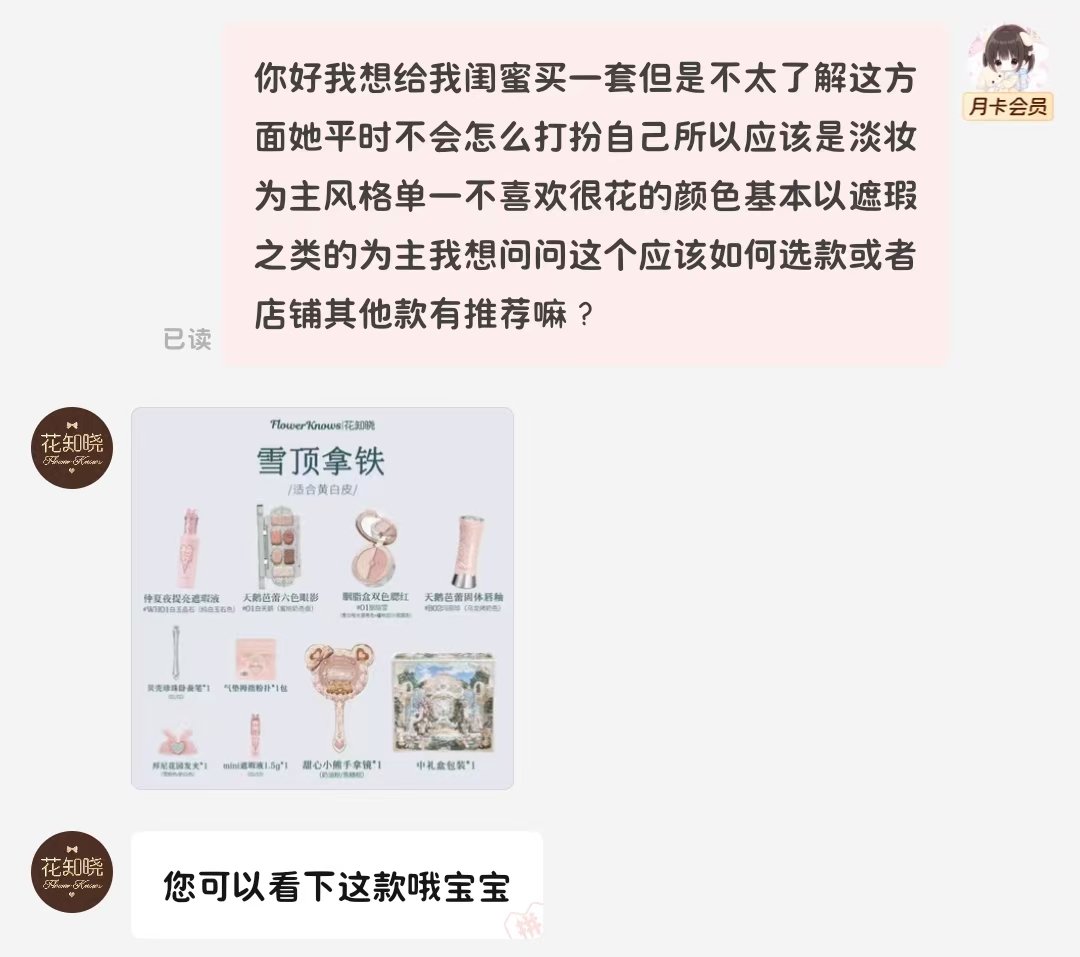 2025年8月18日11:55我发给了她知半城家的海盐喵喵的截图,一粉一蓝我问她要不要一人一个,她说等到开学毕竟她还在上学嘛没有收入来源,这个时候我就是想送她的,后来她也劝我“你自己买不就好了”我就一个劲夸她我说“你明明穿啥都很可爱好不好”后来我直接问她尺码信息了,我问她要啥颜色,她说“看你啦你喜欢哪个?我要另一个”“粉色”