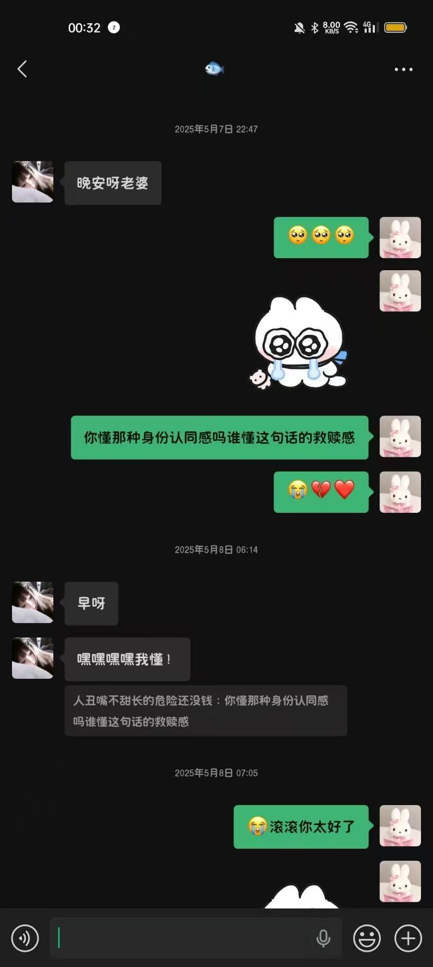 2025年5月2日22:12你第一次叫我“老婆”,当时我是夸了你一声,说你和头像都萌萌,后来我们就习惯了这样的称呼了