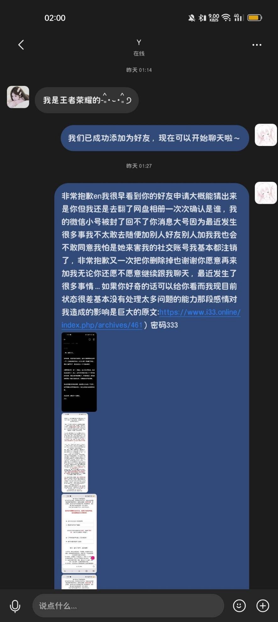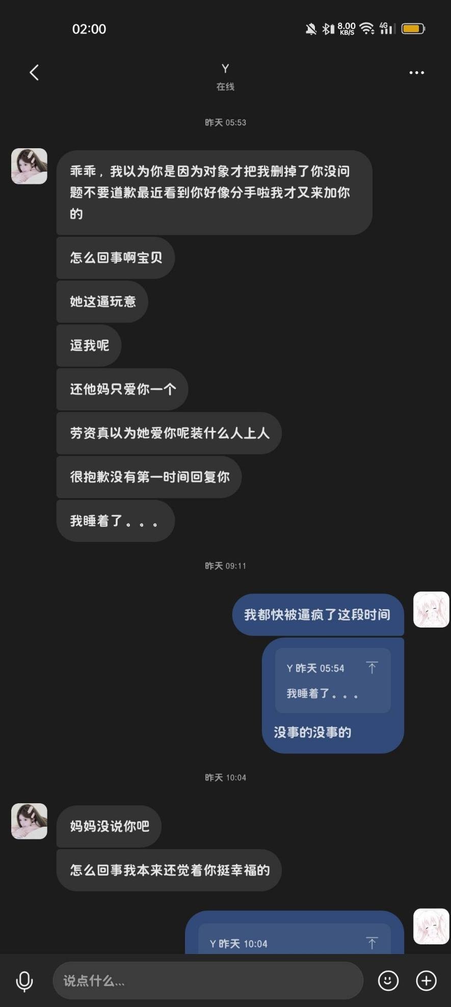 就这样我们还热聊了一段时间跟她说更多事,2025年10月初左右因为我谈恋爱了我们也没有更多的交往了,大约在11月中旬我和我前女友在成都一块玩的时候她半夜拿我手机删除了我90%的网络好友其中包括滚滚,我的大部分社交也基本都来自于网络。