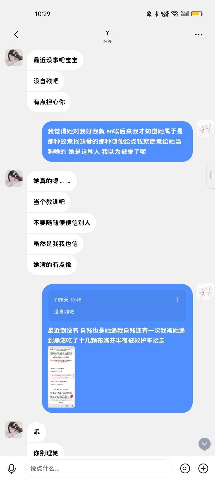 那会俺焦虑也很严重隔几天割手酗酒她也一直陪着我